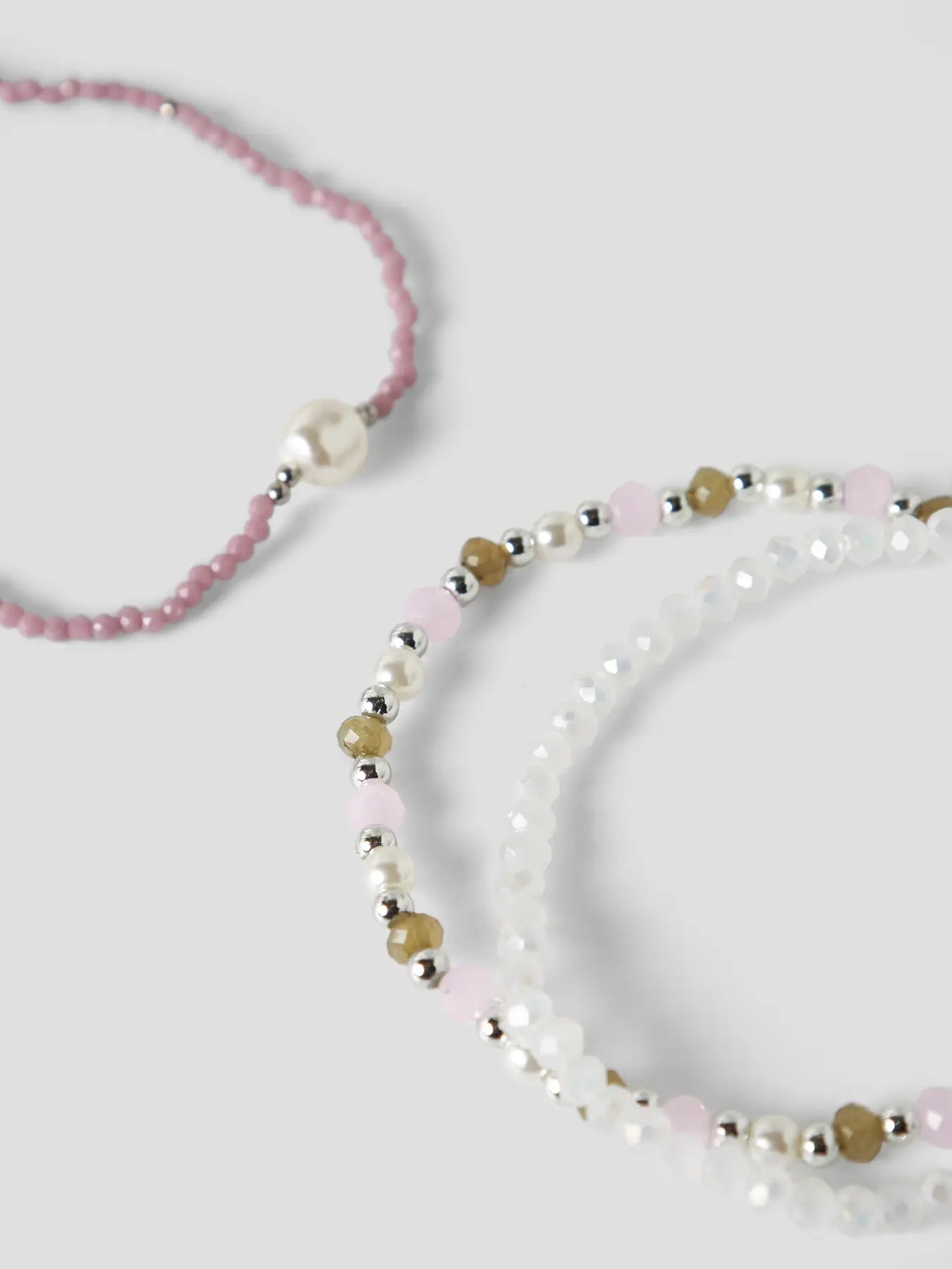 Pärlor i vitt, rosa, silver och grönt