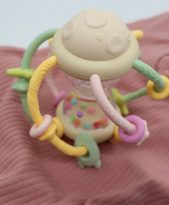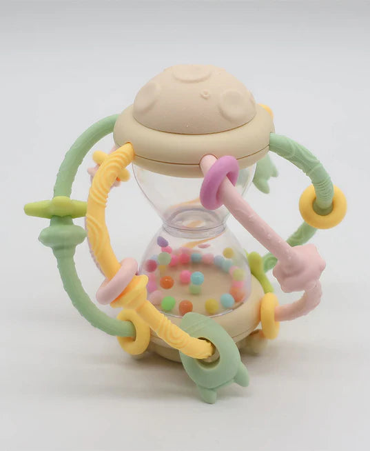 Bitleksak som är både rolig att bita i och ger samtidigt behagliga, men roliga ljud, i form av skallra och ett litet hjul att snurra på.