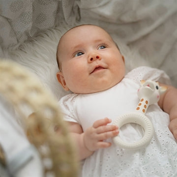 Spännande bitring tillverkad av 100 % rent naturgummi. Exklusivt framställt av naturgummi från Hevea-trädet och färgat med rena växtfärger. Toppen har Sophie la Girafes välkända ansikte och med en stor ring som gör den lätt att hålla i giraffen, och extra bra att bita i tack vare de speciella räfflorna och prickarna som varsamt masserar tandköttet.