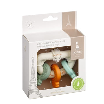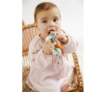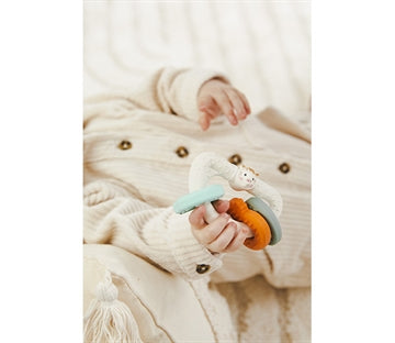 Läcker bitring tillverkad av 100% naturligt gummi, i härligt milda färger formad som en nyckelring. Med många delar att tugga på med olika texturer såsom runda knoppriga hörn och räfflade ytor.