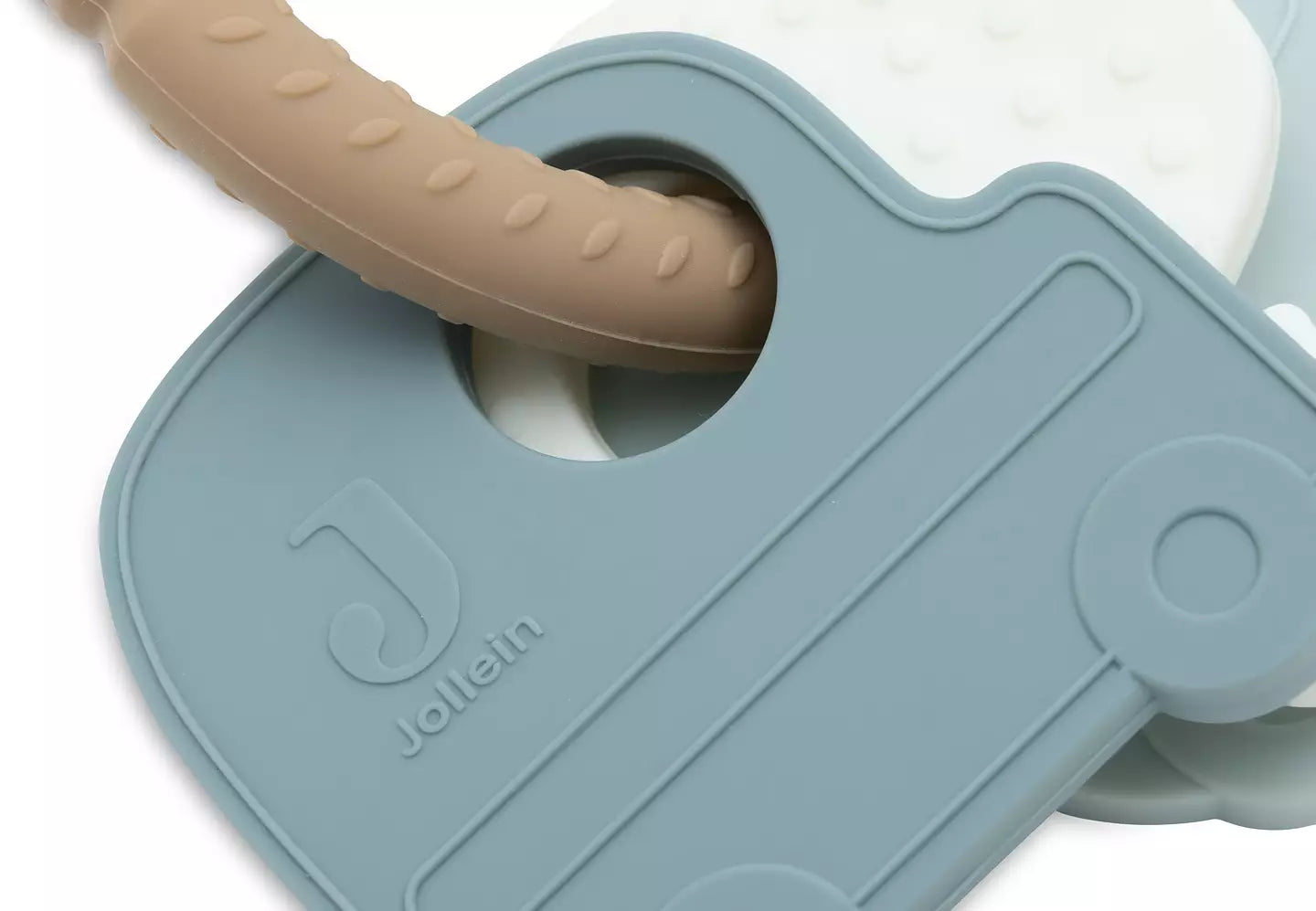 Denna bitring i silikon, med en bil, skåpbil och nyckel är en underbar leksak för små barn som gärna stoppar saker i munnen, särskilt när tänderna är på väg.