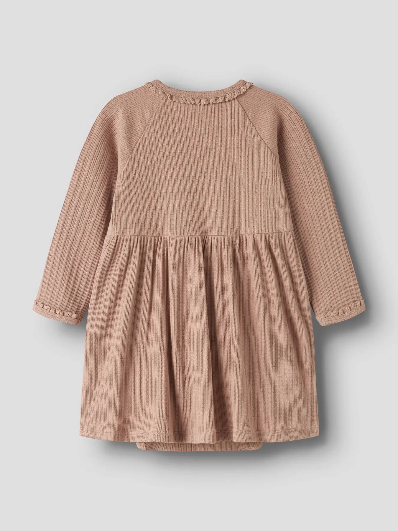 Struktur i tyget och spetsdetaljer vid halsen och ärmslut