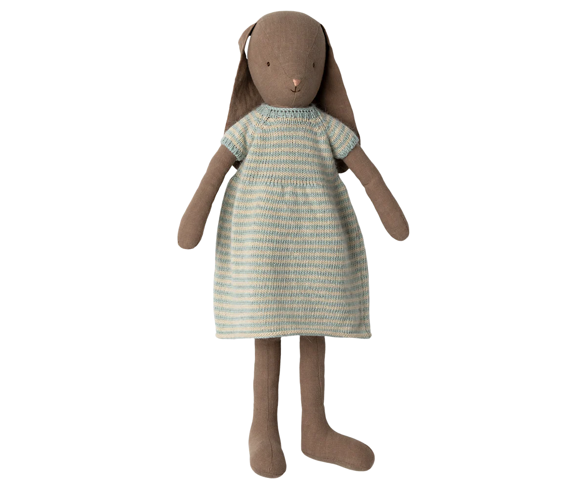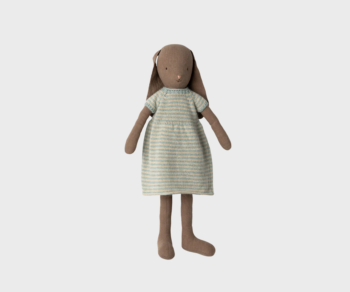 Kaninen är brun och klänningen är randig i beige och ljusblått.