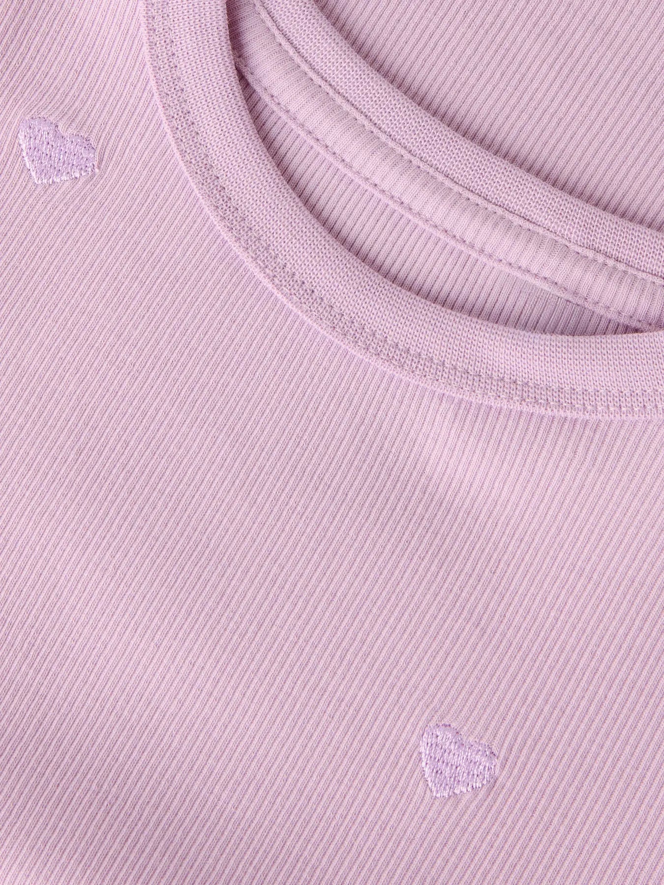 Broderade hjärtan på framsidan i samma lila/rosa färg som tröjan