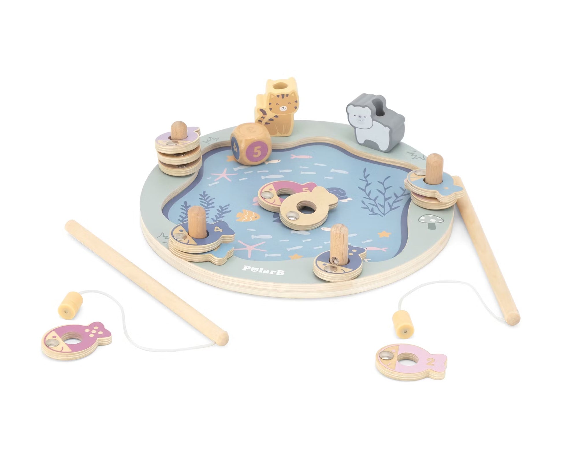 Ett enkelt och fint magnet fiskespel i trä. Lätt att lära och roligt att göra både tillsammans och själv. Fiska upp fiskarna med hjälp av det medföljande fiskespöet med en magnet. Använd tärningen för att se vilka fiskar som ska fiskas upp.