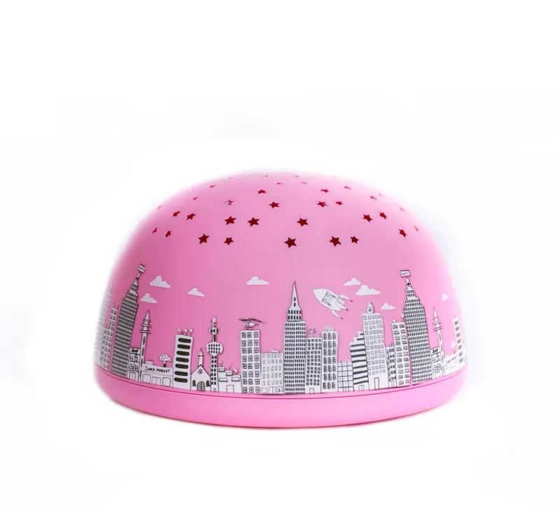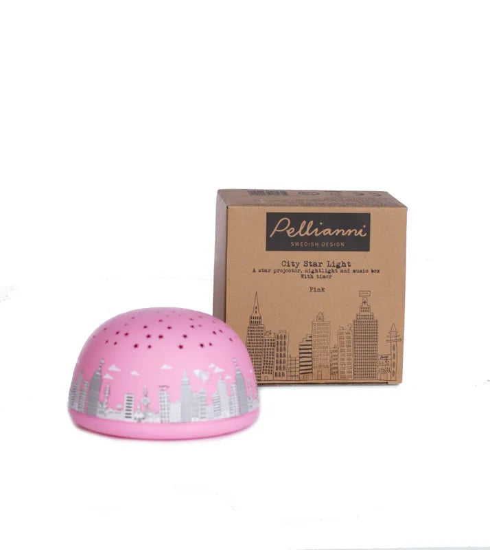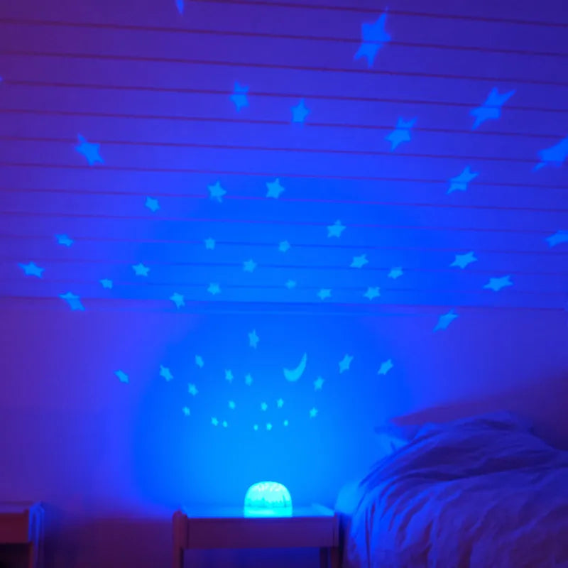 En härlig stjärnprojektor/nattlampa/speldosa i rosa som ger ett behagligt stjärnspel i taket och på väggar. Perfekt att somna till och snurrar INTE. I det första läget skiftar ljuset färg allt eftersom, men ni kan också ställa in den på en viss färg som passar rummet eller den som ska somna: vit, grön röd eller blå. Man kan också välja mellan de 5 olika melodierna om man vill ha musiken på. Med timer som stängs av efter 30 min. På och av-knapp på undersidan tillsammans med med volym- och musikknappen.