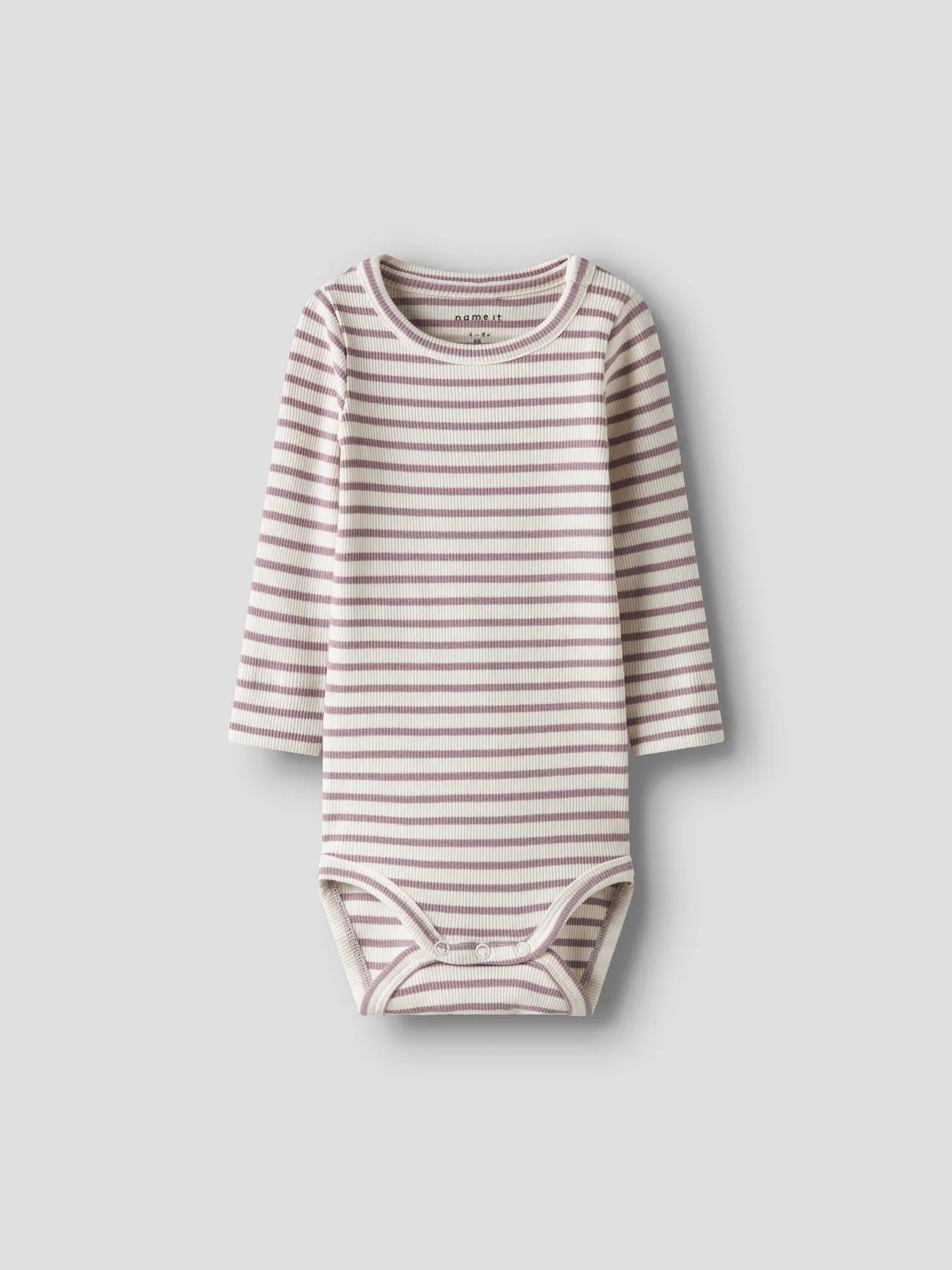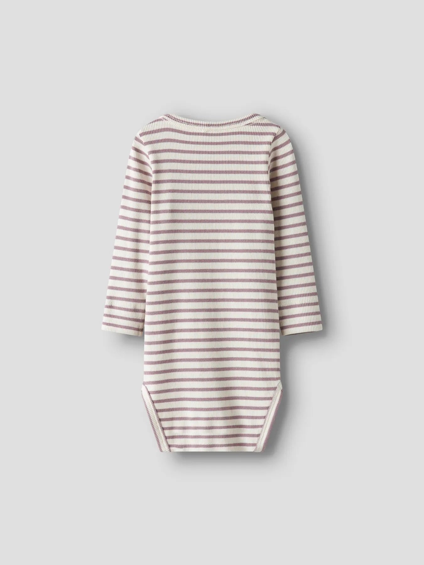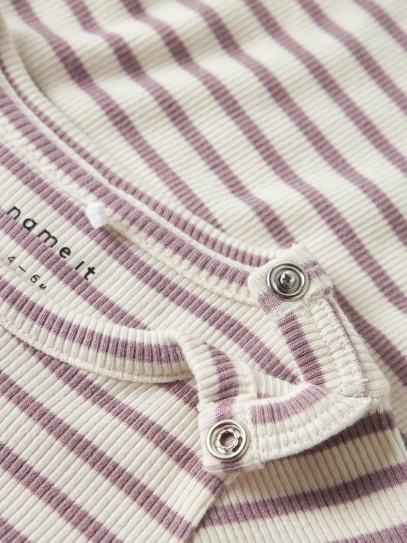 Ribbad body i 57% ekologisk bomull, 38% tencel och 5% elastan. Cremevit botten med lila ränder.