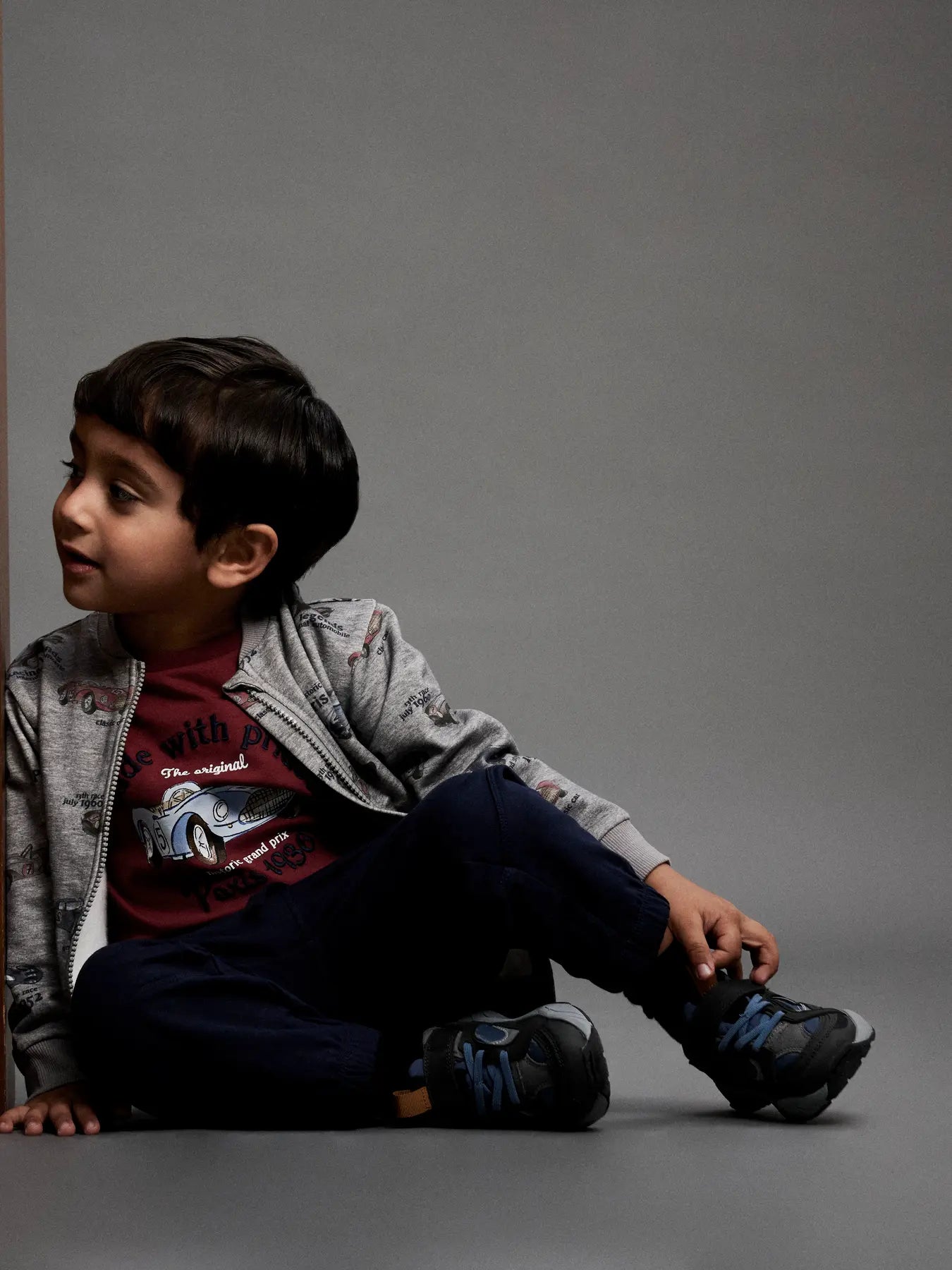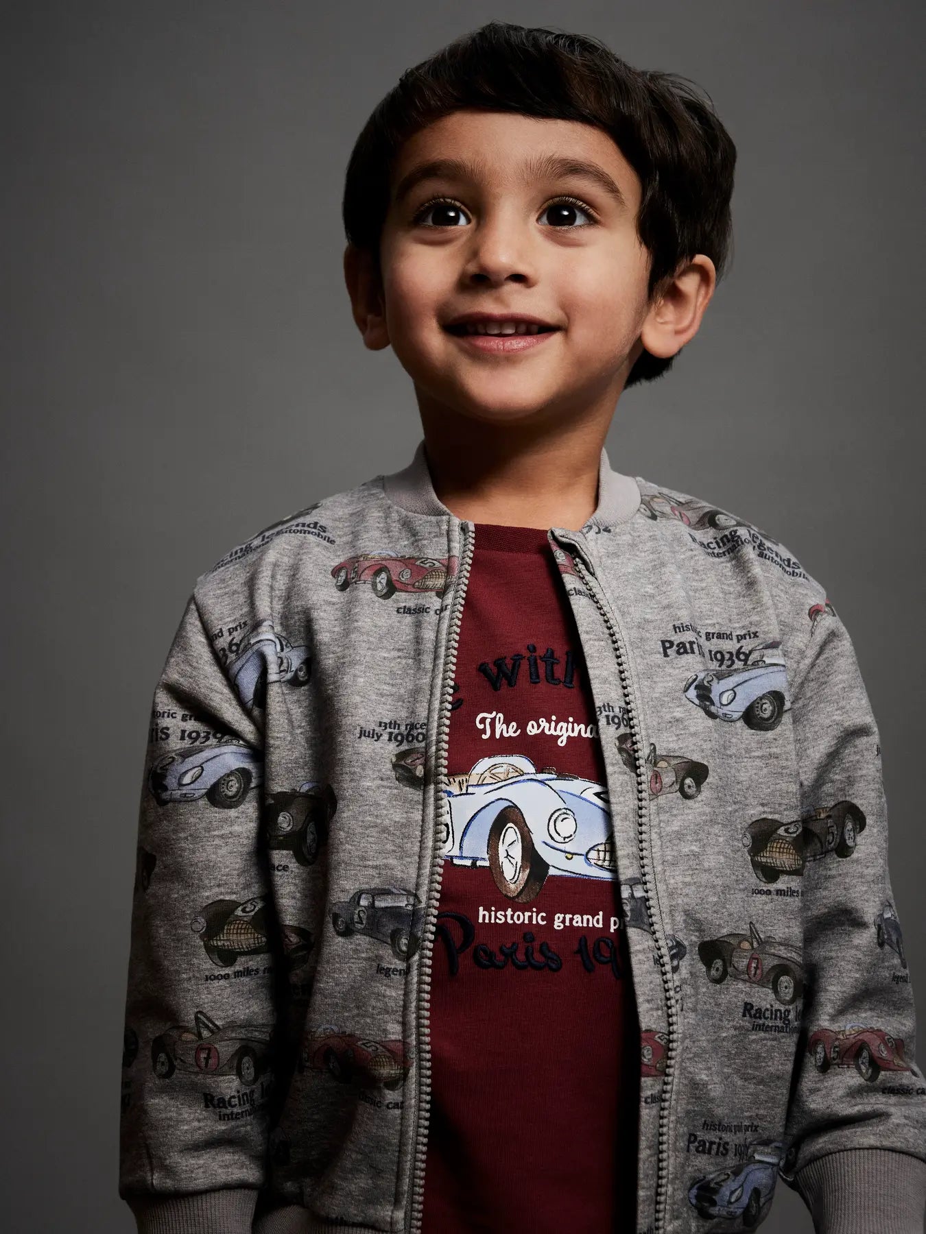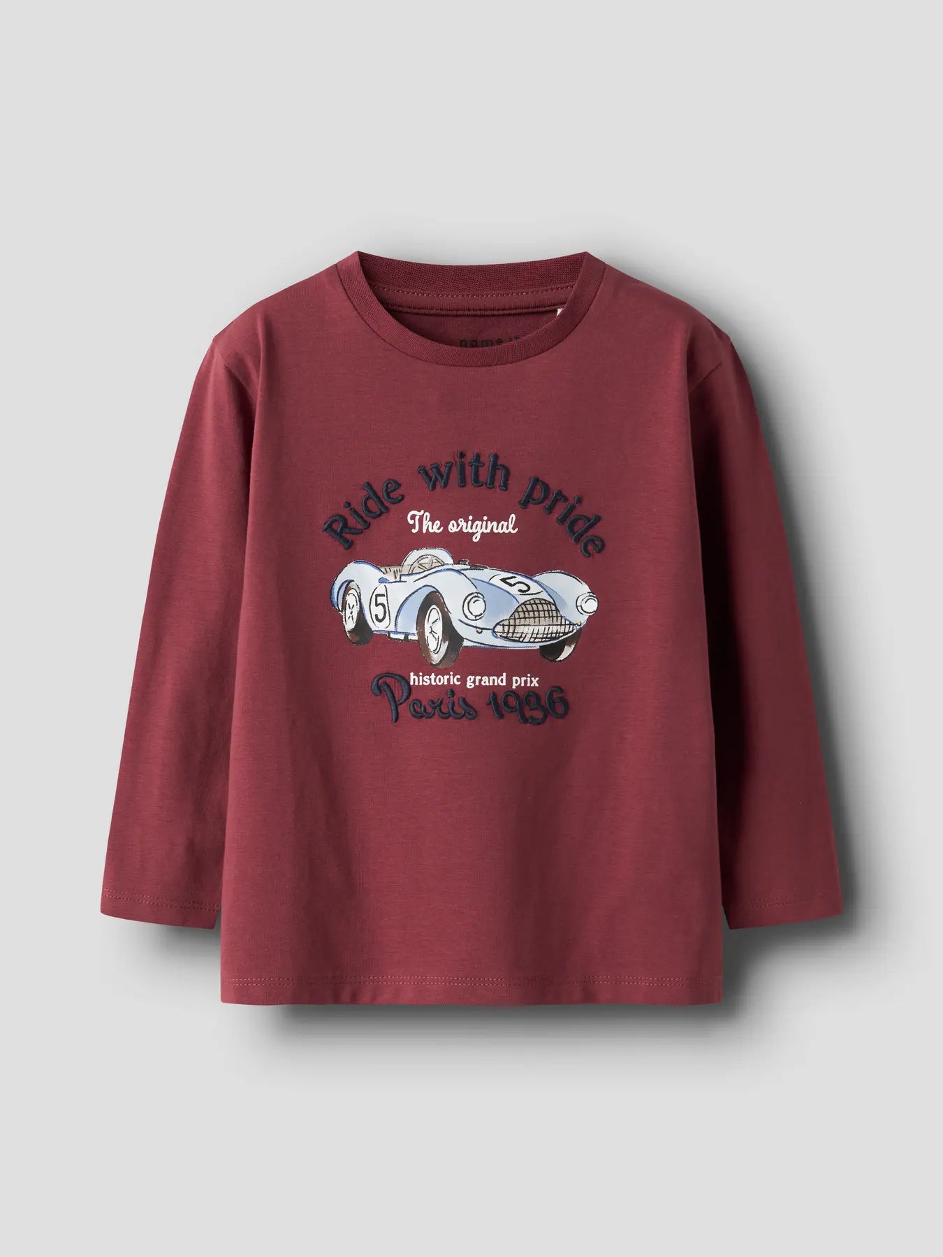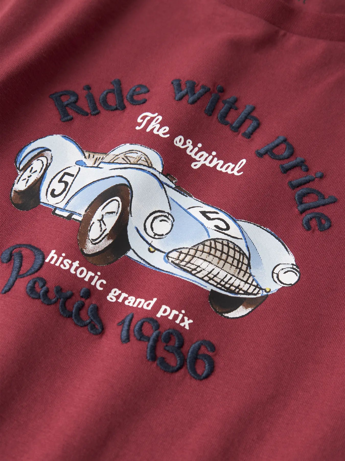 Röd botten med motiv av racingbil i retrostil samt broderad text